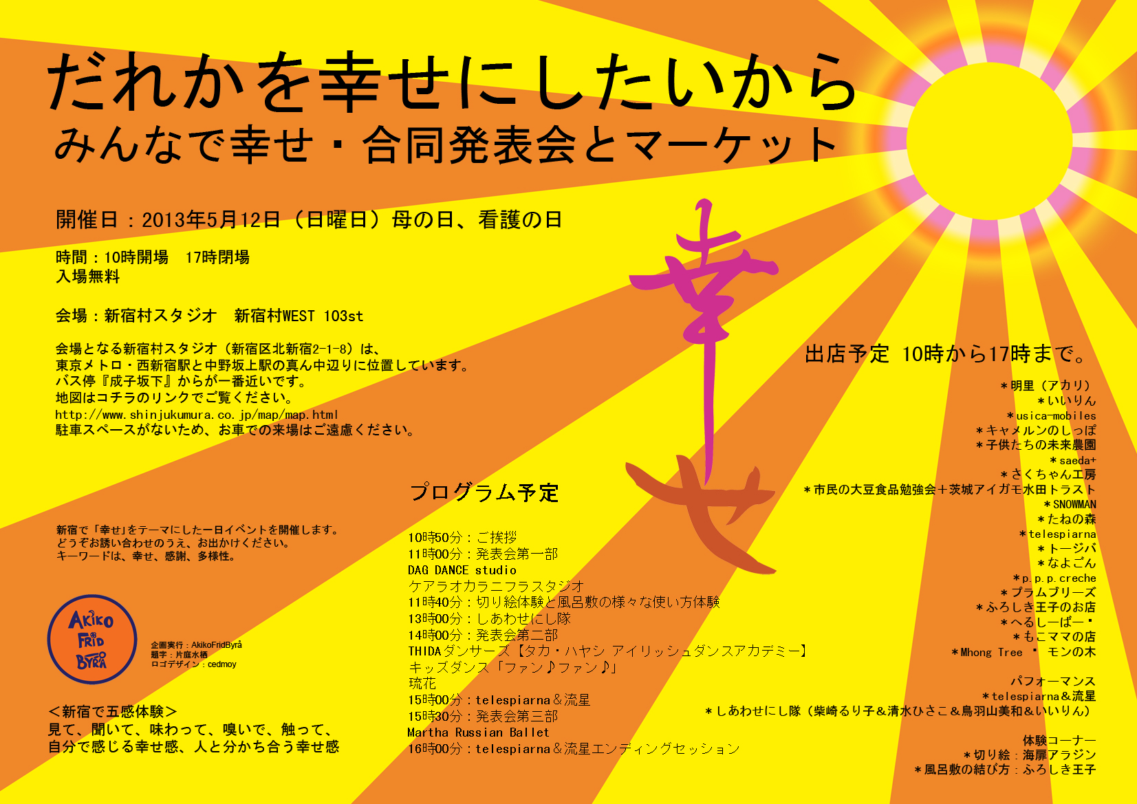 新宿で「幸せ」をテーマにした一日イベントを開催します。どうぞお誘い合わせのうえ、お出かけください。
